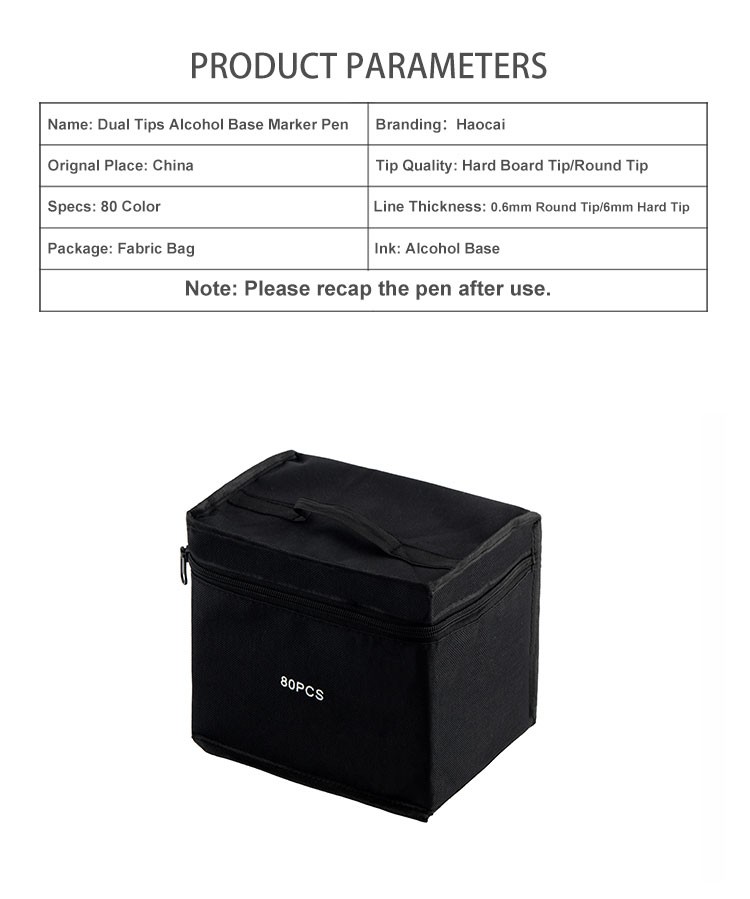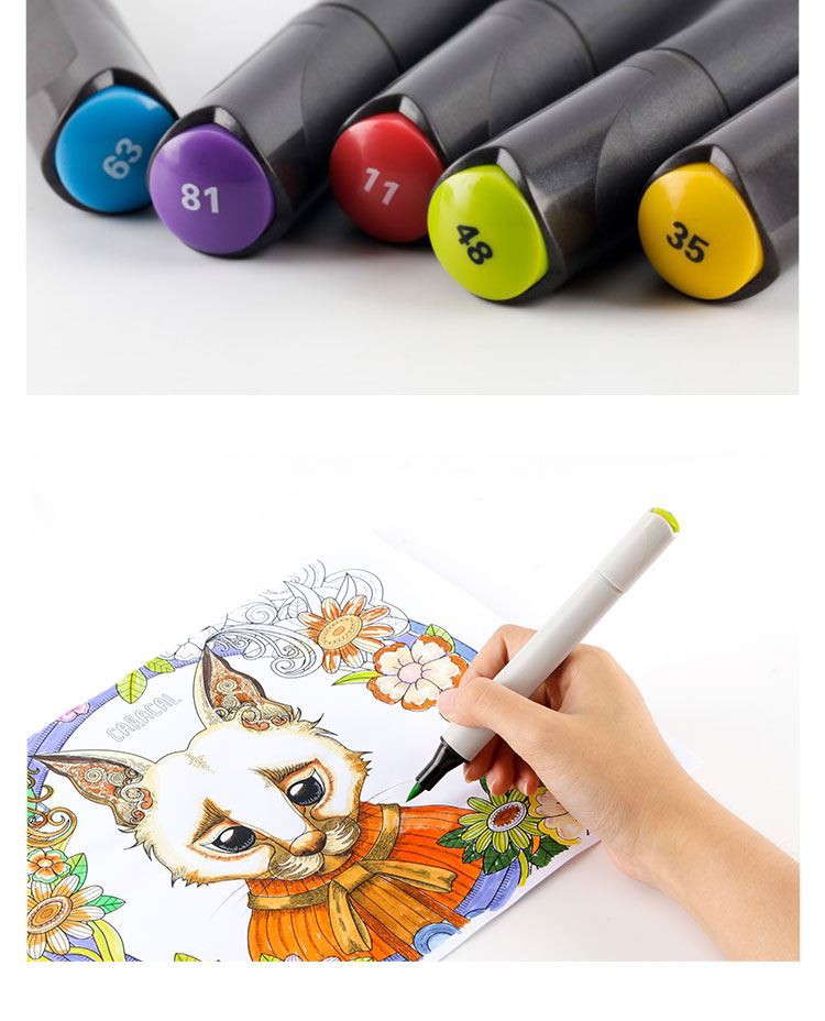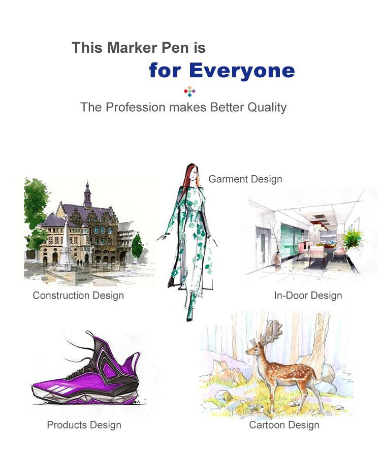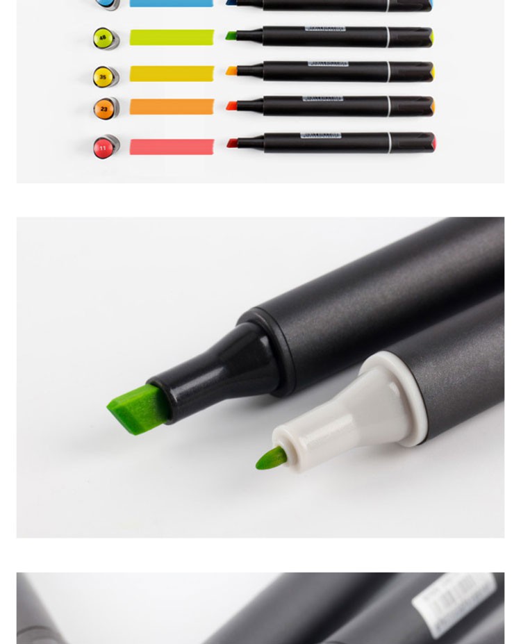 طرحهای مختلف-دو سر: نشانگرهای هنری قلم موی نوک دوتایی جوهر الکلی دارای دو رنگ سیاه و سفید است و طراحی منحصر به فرد جا خودکار جابهجایی در هنگام استفاده را دشوار میکند. اسکنه درشت و نقطه ریز با وجه انتهایی دوتایی، با خواص چند منظوره. نوکهای ظریف-را میتوان برای نشانههای خوشنویسی دقیق استفاده کرد، نوکهای اسکنهای پهن برای مناطق وسیع کاربرد مناسب هستند، و دو نوک مختلف برای ترکیب یکپارچه رنگها برای بهبود کارایی رنگ طراحی شدهاند.